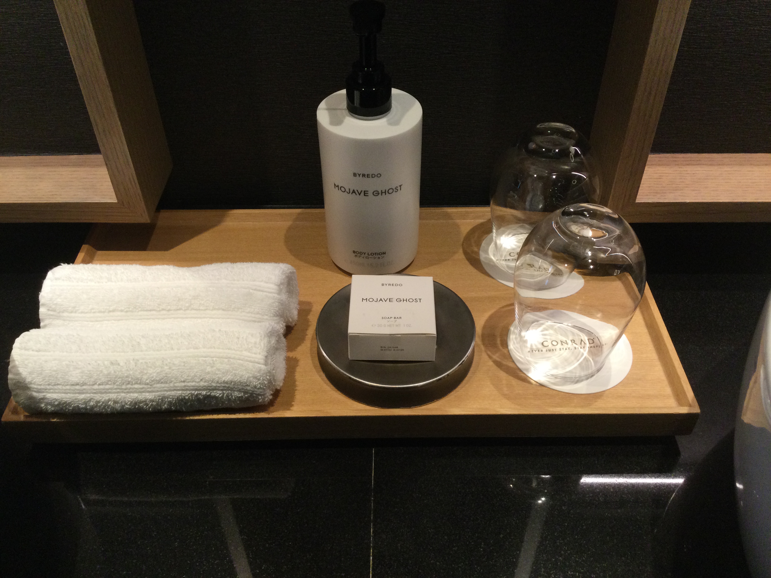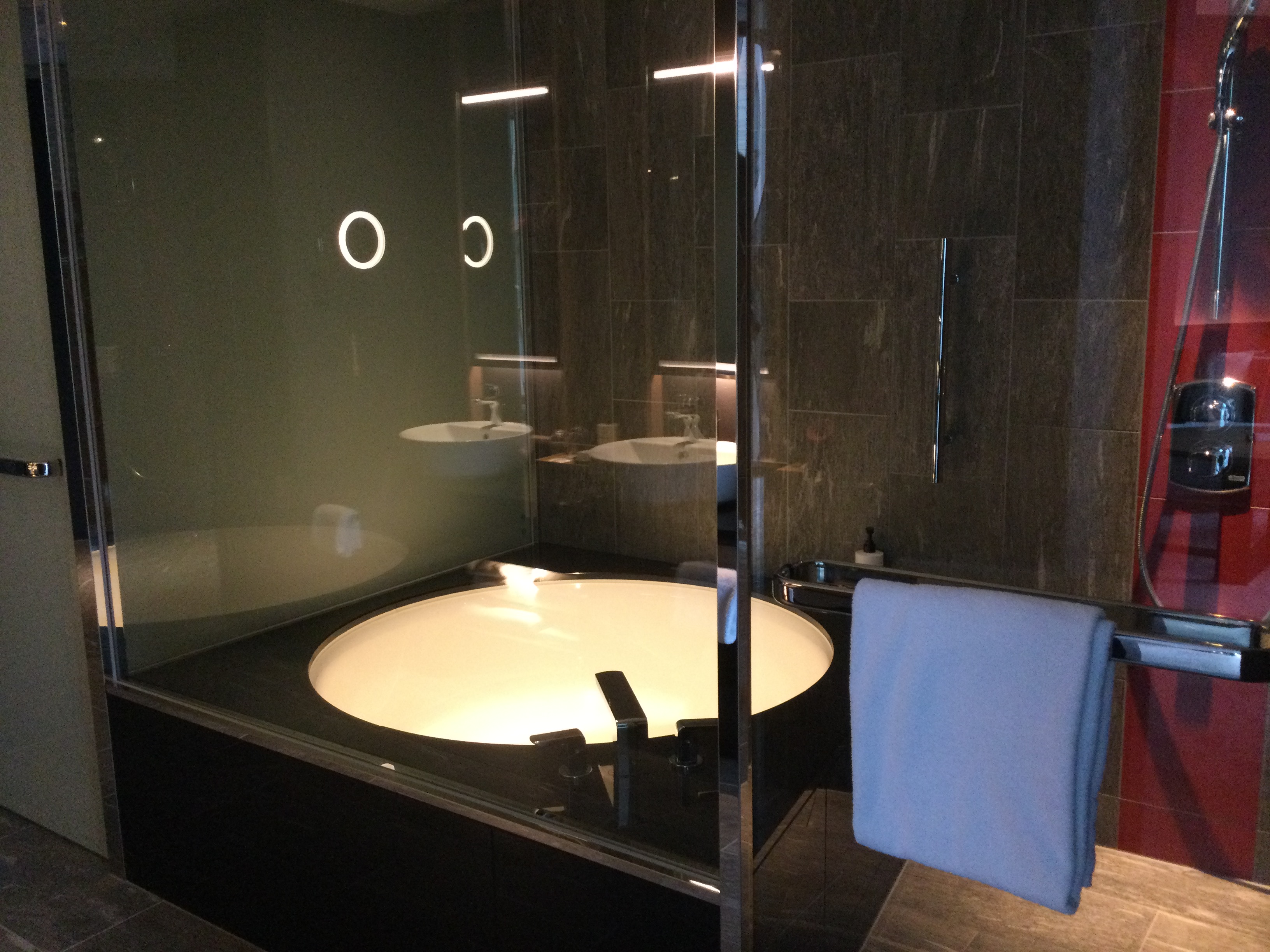 バスルームはガラス張りで丸いバスタブが特徴です。アメニティ(シャンプー、リンス、ボディーソープ)はラグジュアリーフレグランスブランド「Byredo」で統一されていました。