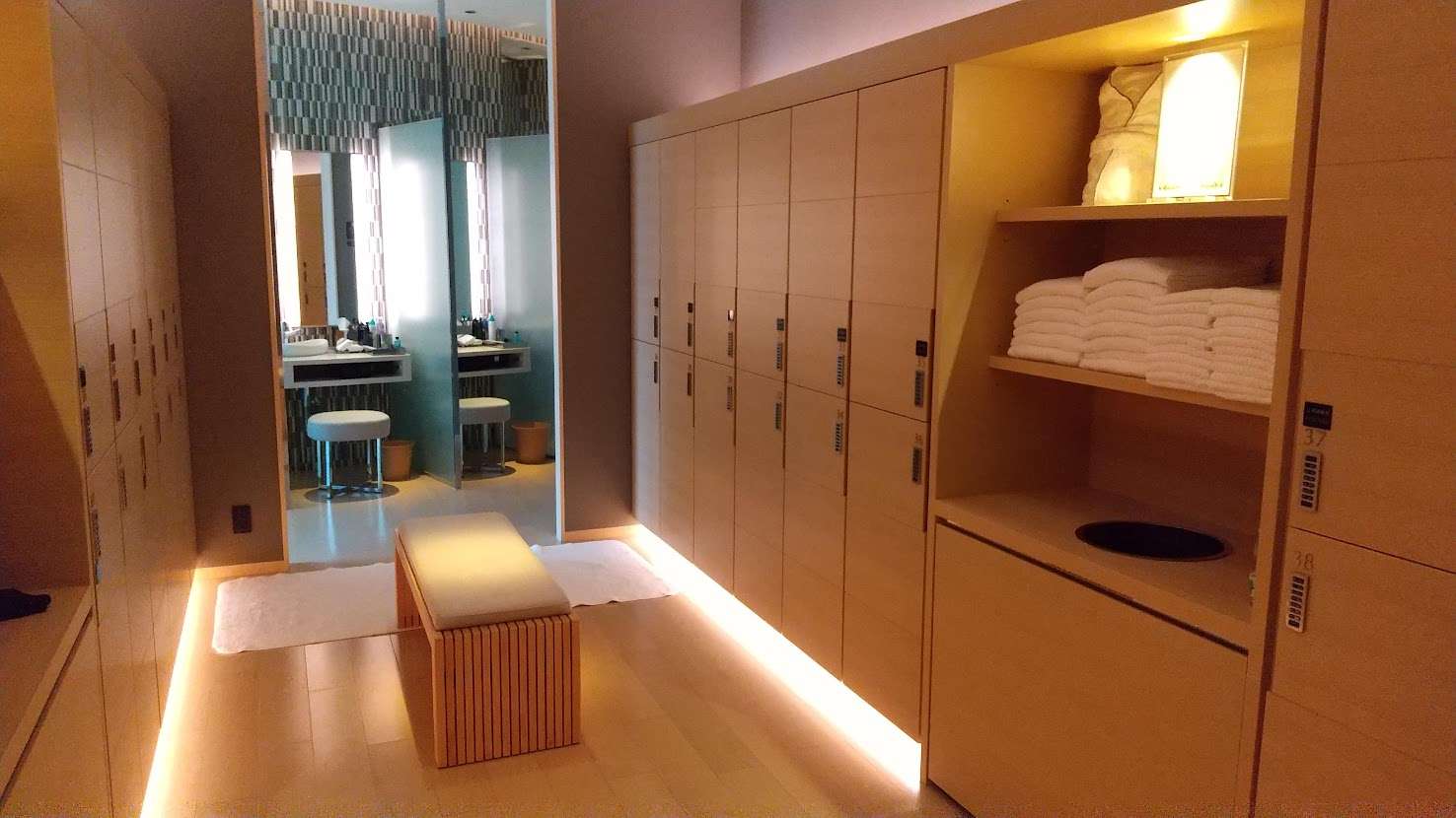 ロッカールームの靴箱とロッカーの鍵は4桁のナンバーを入力してロックするタイプでロッカールームにはタオル、バスローブなど用意されています。ロッカーの奥には化粧台もあります。