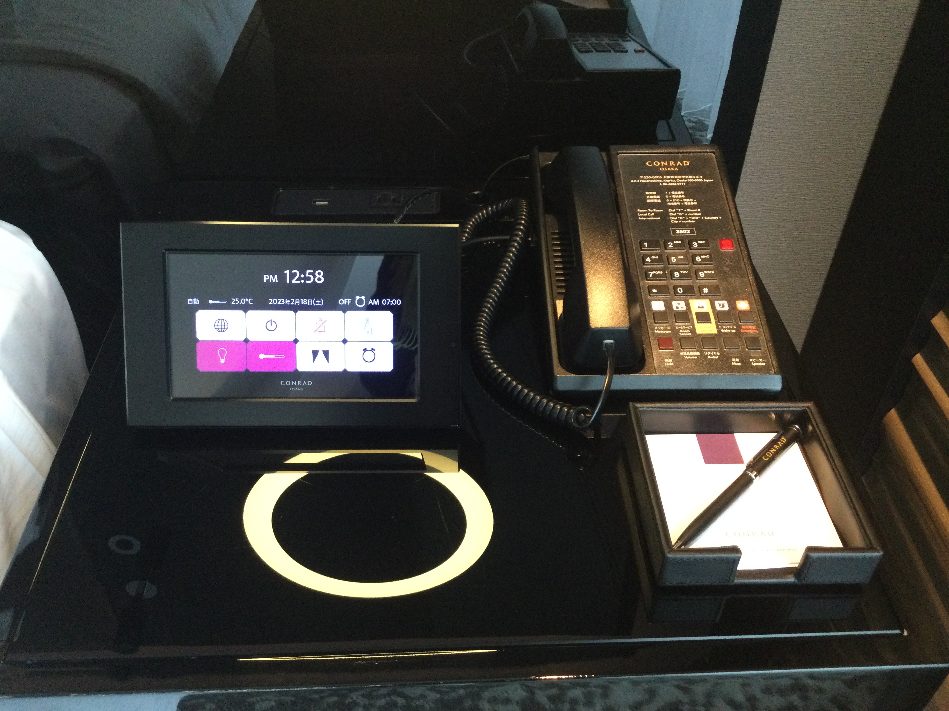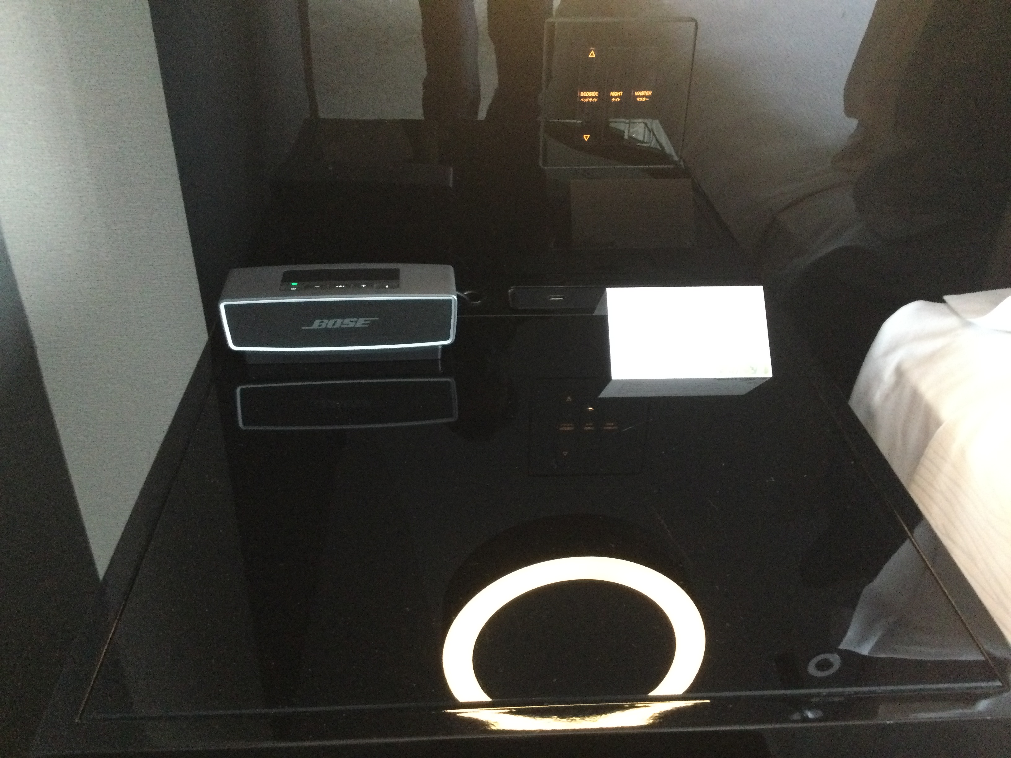 ベットのサイドには、BOSEのBluetoothスピーカー、メモ帳、電話、タッチパネルのリモコンが設置されていました。リモコンで電動カーテンなどを操作することができます。