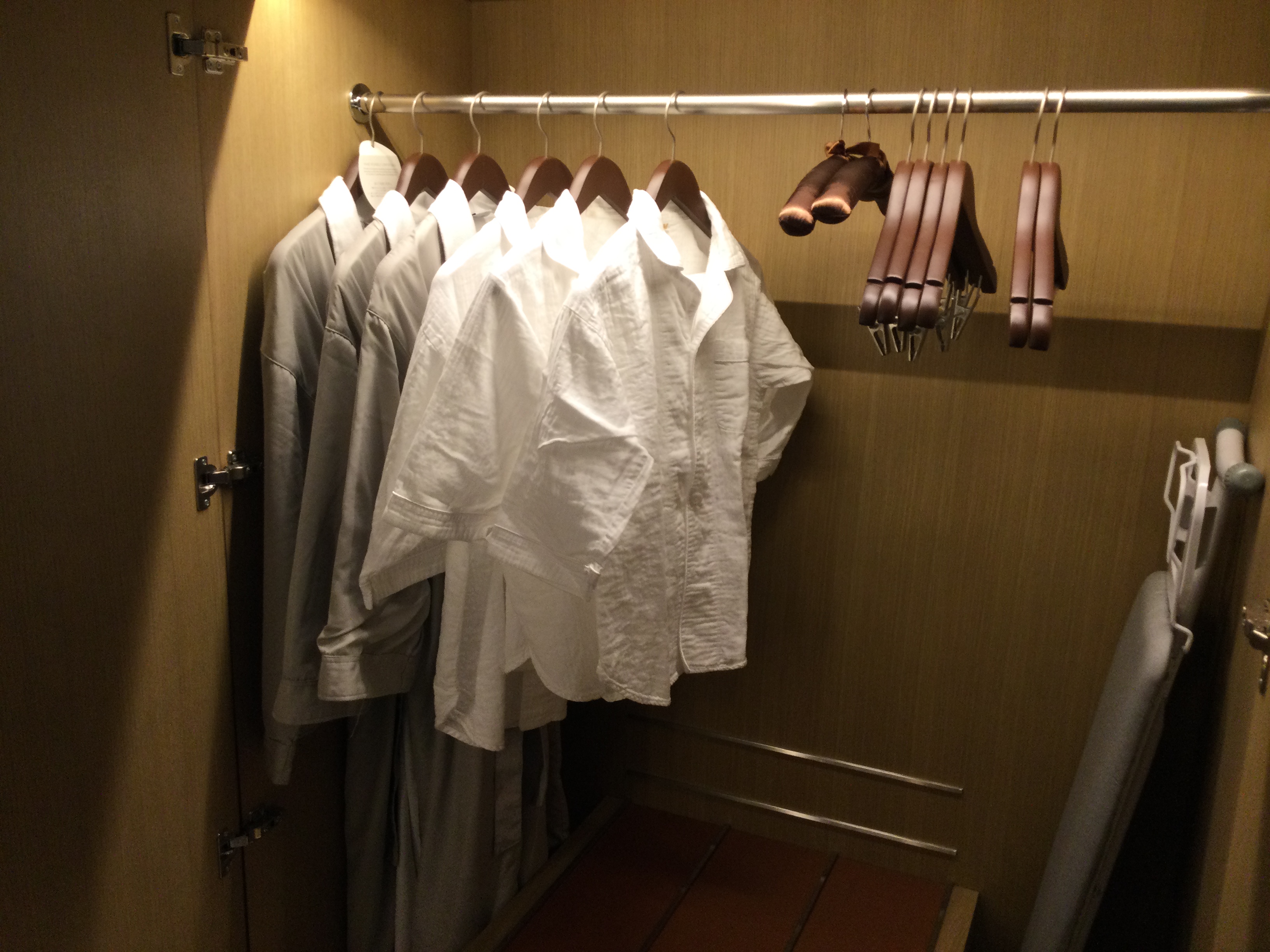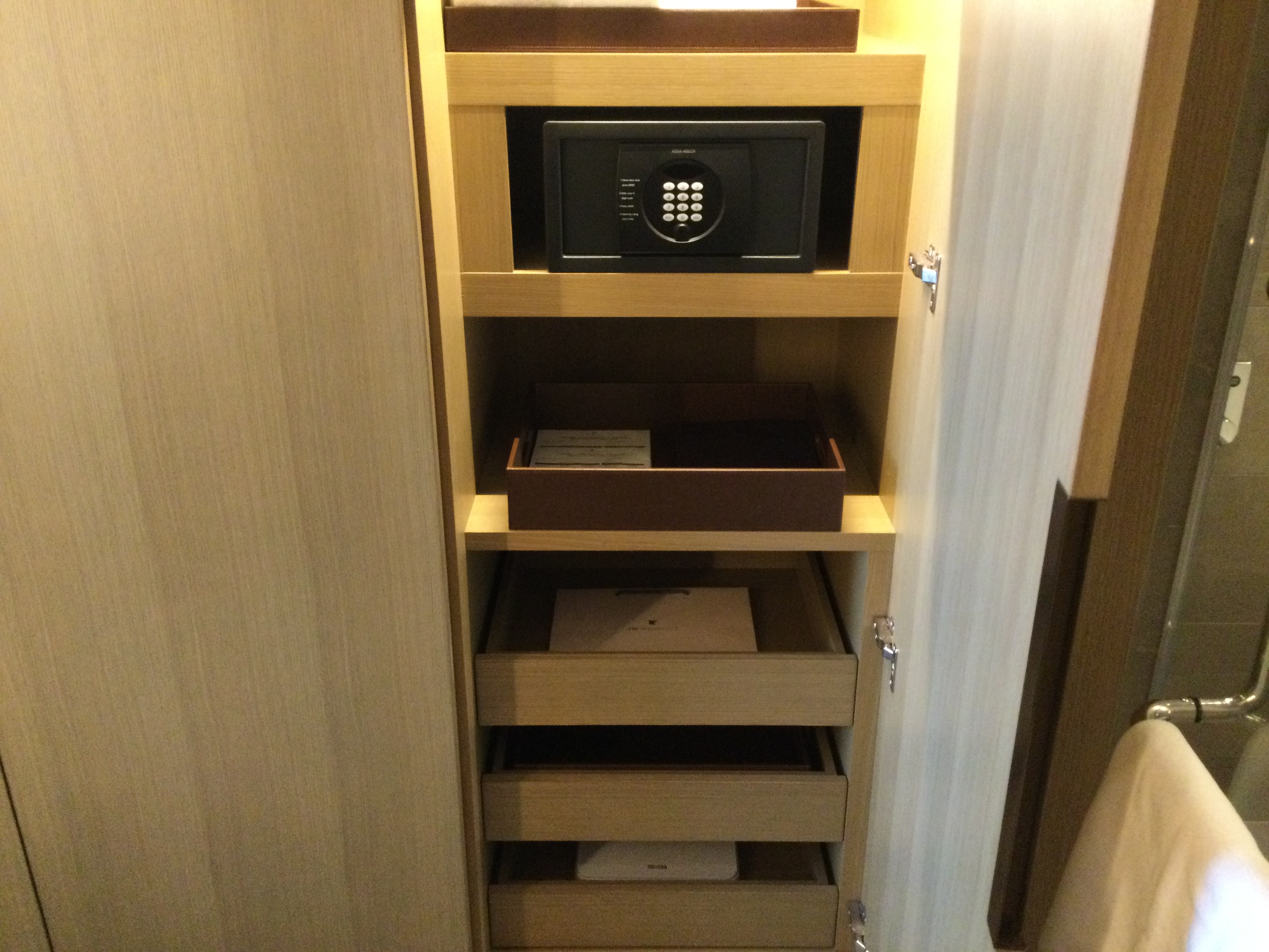 クローゼットにはバスローブとパジャマが掛けられていました。クローゼットすぐ横の棚にはセーフティーボックス、スリッパなどが収納されています。