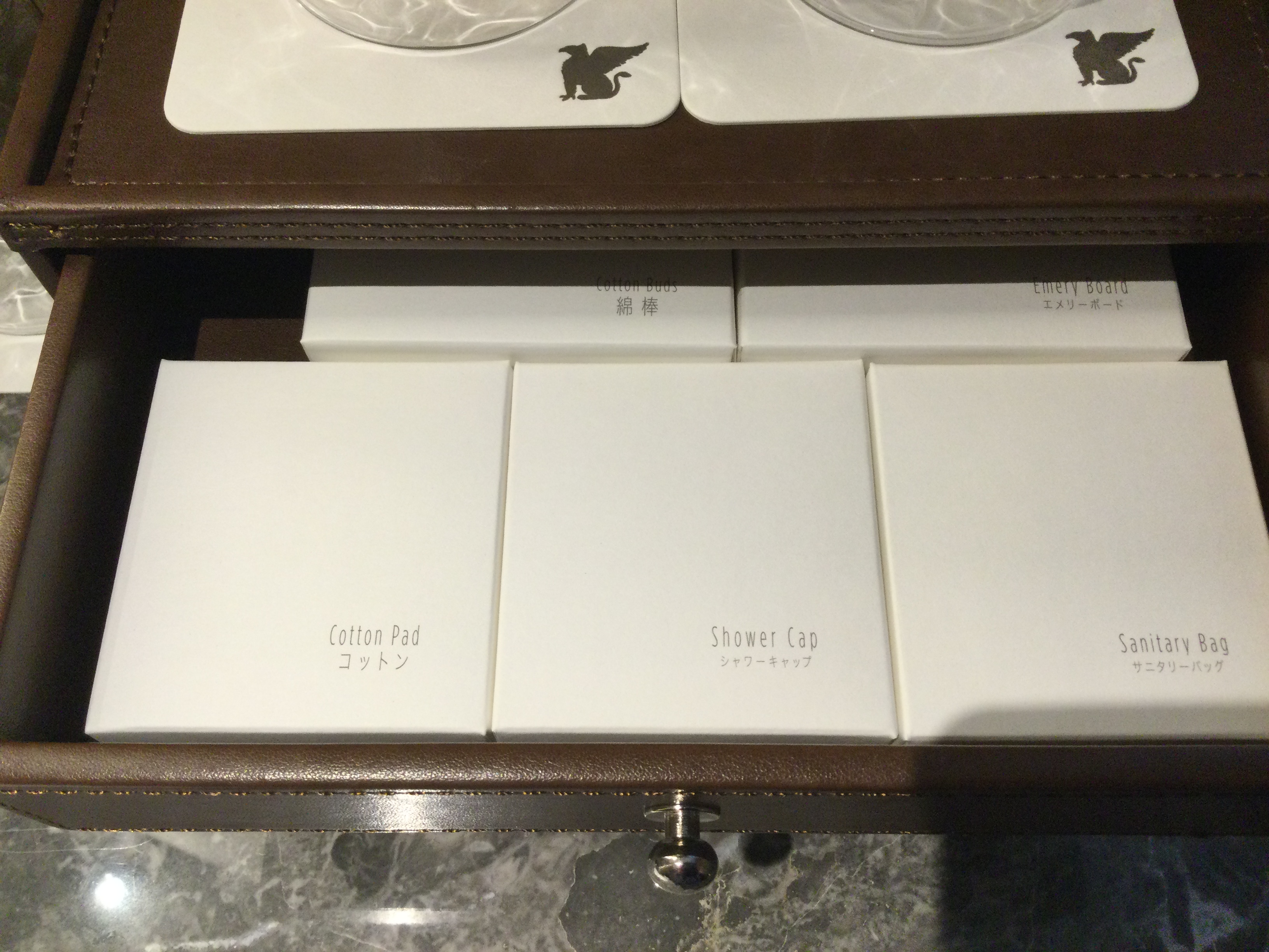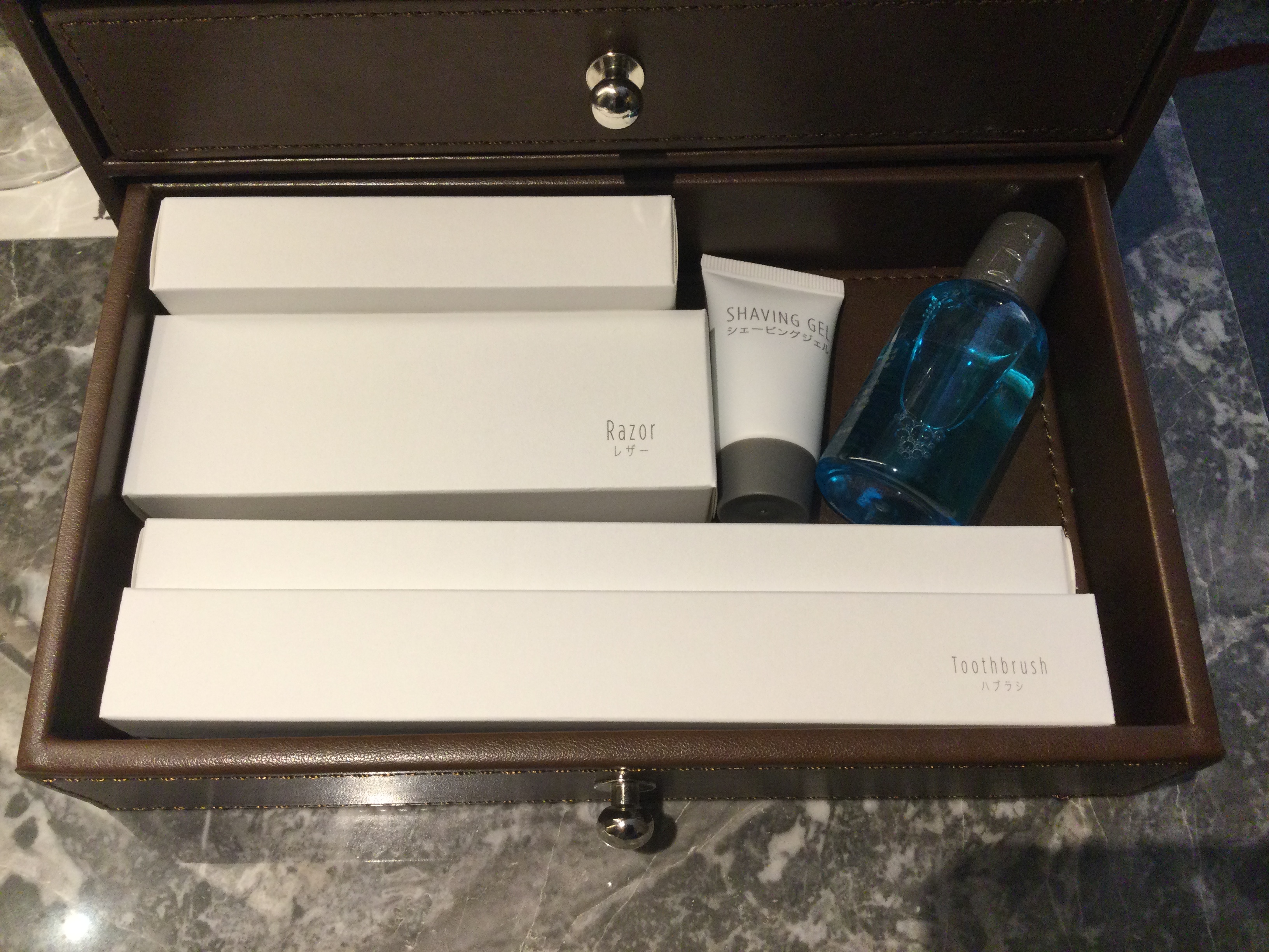 アメニティボックスは、歯ブラシ、髭剃り、ブラシなどが全て個包装できれいに並べてあります。